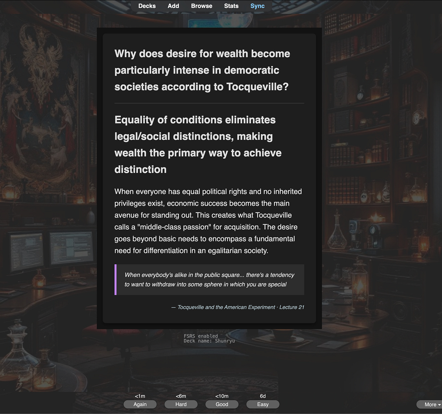 Listen to a lecture at 75% attention, do some chores, then drop a quick msg to your chatbot. Something confusing? The lecture transcript + the LLM’s innate wisdom can clear it up. Then, voila. A dozen beautifully formatted flashcards into your Anki deck. Spend 5 minutes every morning and they’ll gradually drip into long-term storage. Over the past couple years I’ve probably put most of an undergrad history minor into my brain in this really passive, low effort way.
