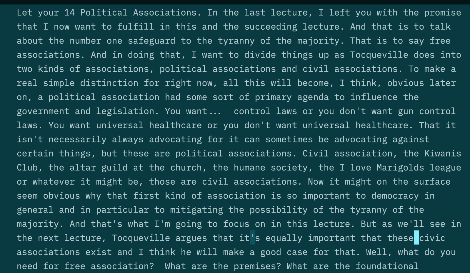 Use the Basic with Explanation card type. IF there are any memorable quotes worth adding, add them as the Reflection Quote type. Important: make sure the created cards are tagged with the same acronym and naming convention as what should be in the other lectures in the series: #whole_course_acronym #whole_course_acronym[number_of_lecture]. i.e., for "Democracy in America"'s 5th lecture, #DIA #DIA5. look at other cards for guidance (though if none are present, select the simplest, shortest acronym).